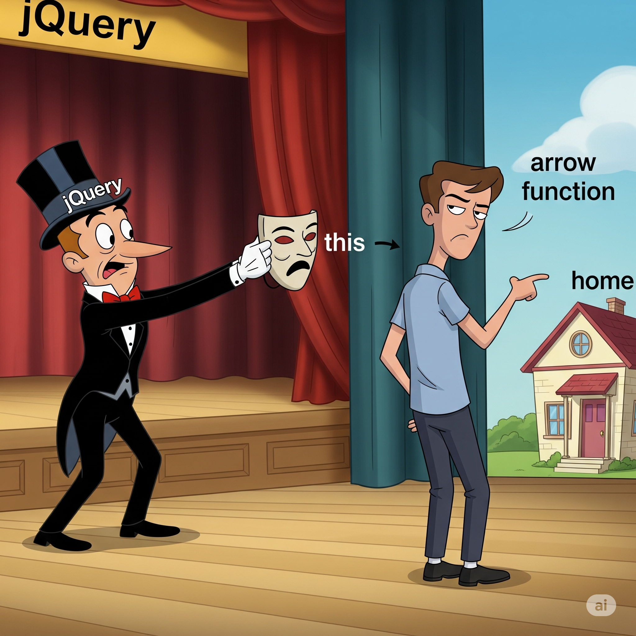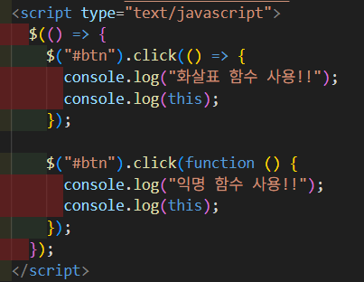 결론 : 그래서 jQuery 이벤트 핸들러에서는 하나의 요소에 하나의 이벤트만 발생하는것이 아니기 때문에 이벤트가 발생한 요소로 바뀌어야한다. 그래서 function을 사용하는 편이 좋다.