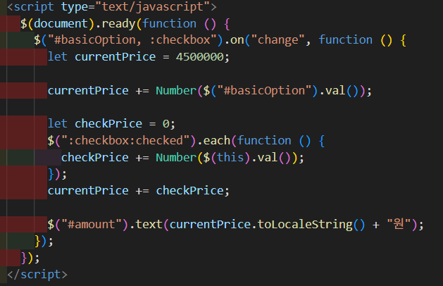 이렇게 옵션그룹의 id값인 basicOption과 체크박스에 해당하는 값들에 이벤트(등록된 change이벤트)가 발생하면 해당 로직이 작동하여 최종 금액을 계산해줄 수 있다 그리고 숫자값 뒤에 toLocalseString()을 사용하면 450000으로 표시될 값을 4,500,000 이렇게 콤마(,)를 붙혀서 표기할 수 있게 해준다.