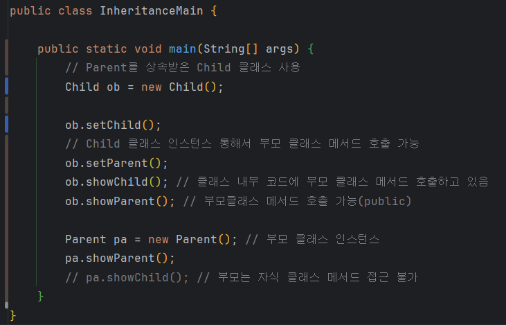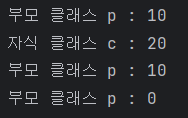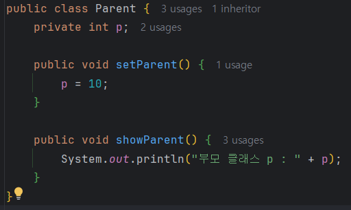 이미지를 보면 부모의 기능을 상속 받은 자식 클래스가 부모 클래스에 존재하는 setParent() 와 showParent() 메서드를 사용하는 모습을 확인할 수 있다. 그리고 당연히 본인이 선언한 메서드도 사용하는 모습도 확인할 수 있다.