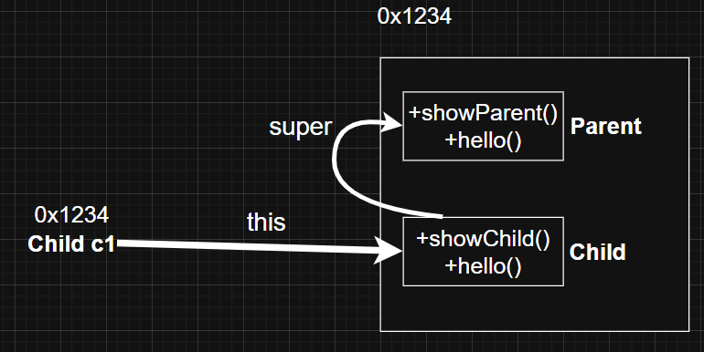 겉보기에는 Child 인스턴스 하나만 생성하는 것처럼 보이지만 내부에서는 부모 클래스인 Parent도 함께 생성이되고 서로 독립적인 공간을 점유한다.