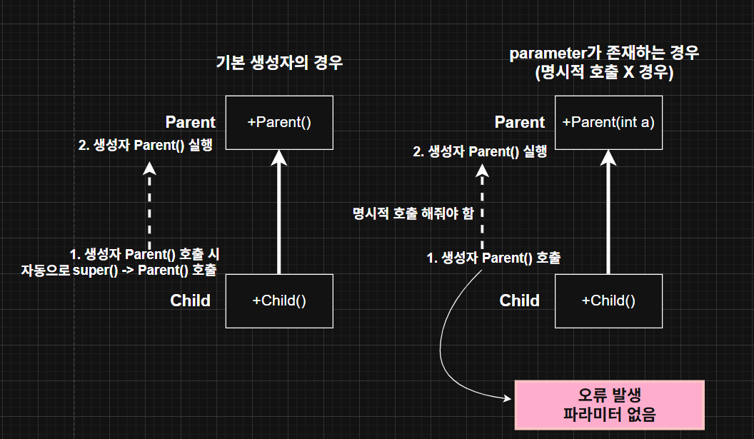기본 생성자(디폴트 생성자)의 경우 생략이 가능하기 때문에 상관없지만(자바가 부모의 기본 생성자를 호출하는 super()를 자동으로 만들어 줌), 파라미터가 있는 생성자라면 꼭 자식 클래스에서 호출 해줘야한다. 그렇지 않으면 컴파일 오류가 발생한다.
