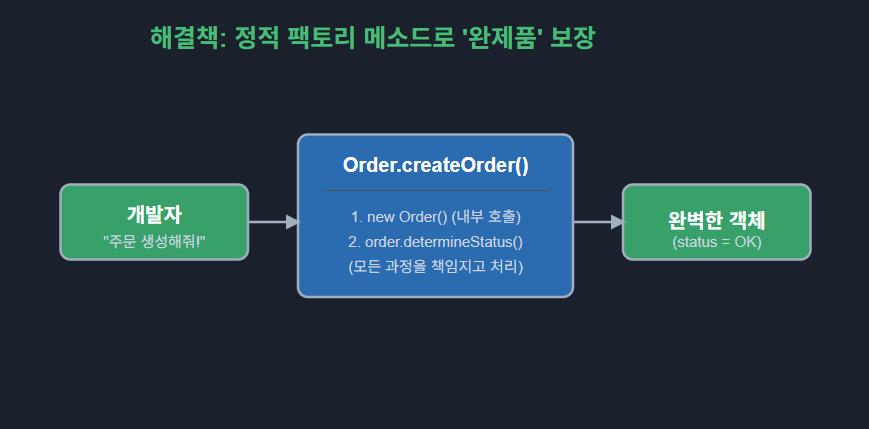 - 정적 팩토리 메서드 : 오므라이스 주세요(Order.createOrder()) 라고 주문만 하면, 요리사(팩토리 메서드)가 알아서 복잡한 과정을 거친 뒤 나에게 완전히 요리된 완제품을 내어주는 것과 같다.