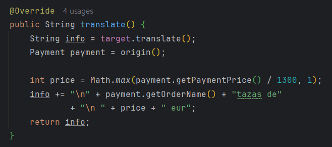 - UsaDecorator 클래스는 실제로 장식을 추가해줄 클래스이다. UsaDecorator, JapanDecorator등은 모두 PaymentDecorator를 상속받아 target의 translate()를 먼저 호출한 뒤에 자신만의 번역문을 덧붙히는 방식으로 동작한다.