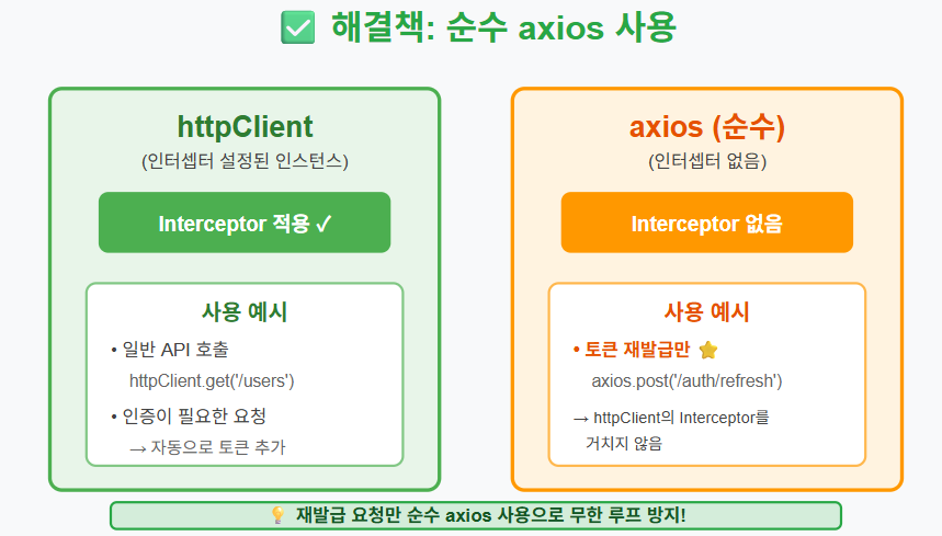 해결책은 의외로 명확했다. 토큰 재발급 요청만 순수 axios를 사용하는 것이다.